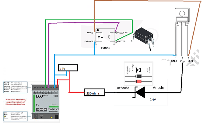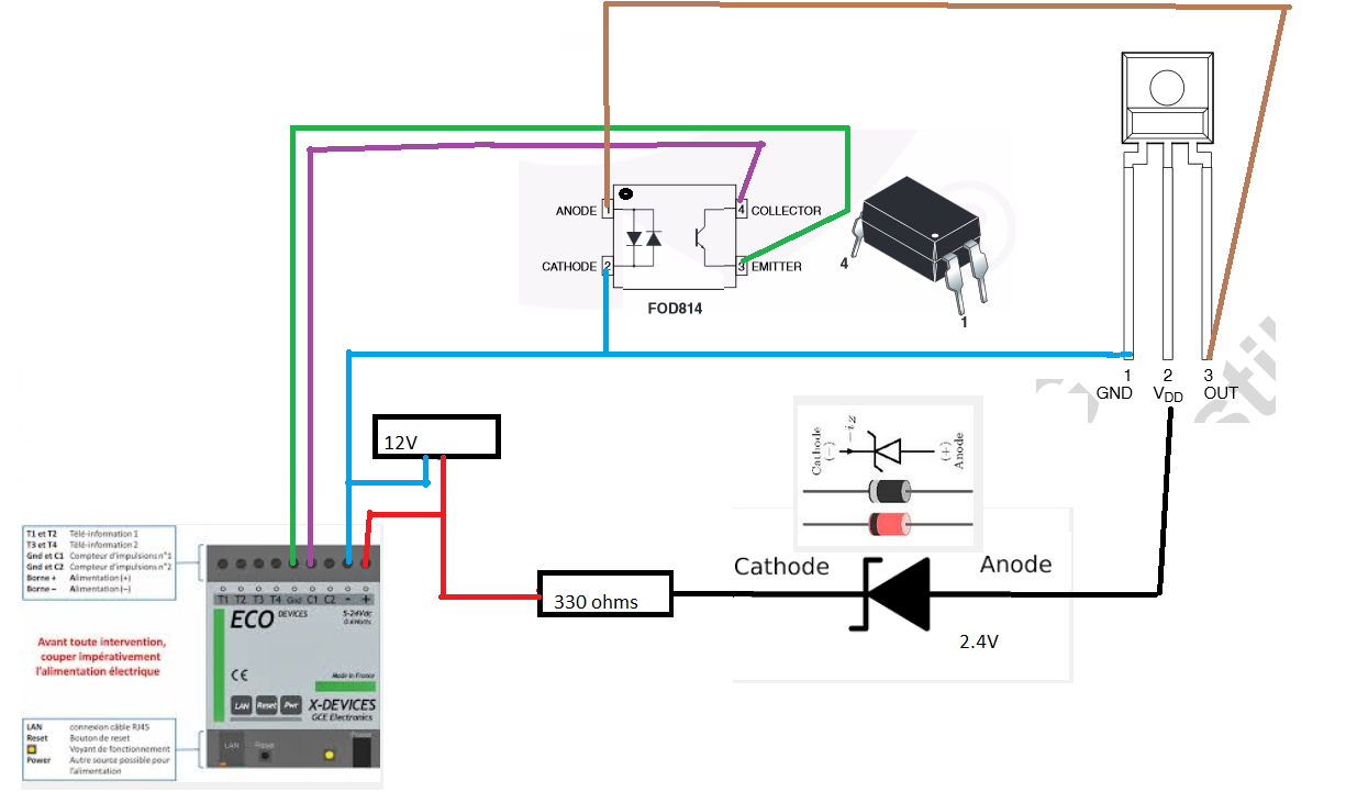 Avec un fil qui sort de la borne (-) de l’eco device, brancher d’une part la patte GND de la photodiode (patte gauche en la regardant de face) et d’autre part la cathode (patte 2) de l’octocoupleur FOD814 (se referer au pdf datasheet de l’octocoupleur (le petit point blanc sur un des coins de l’octo))
