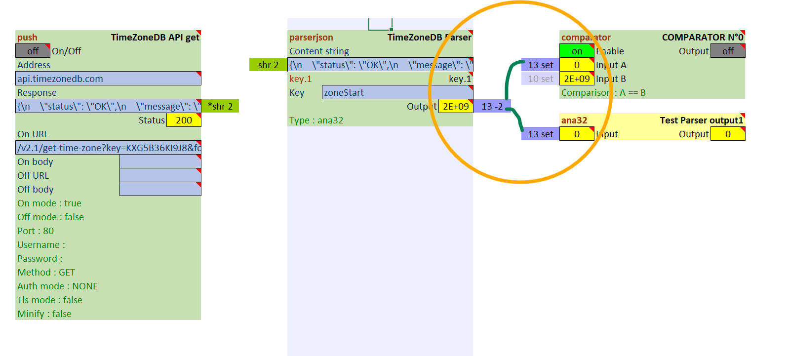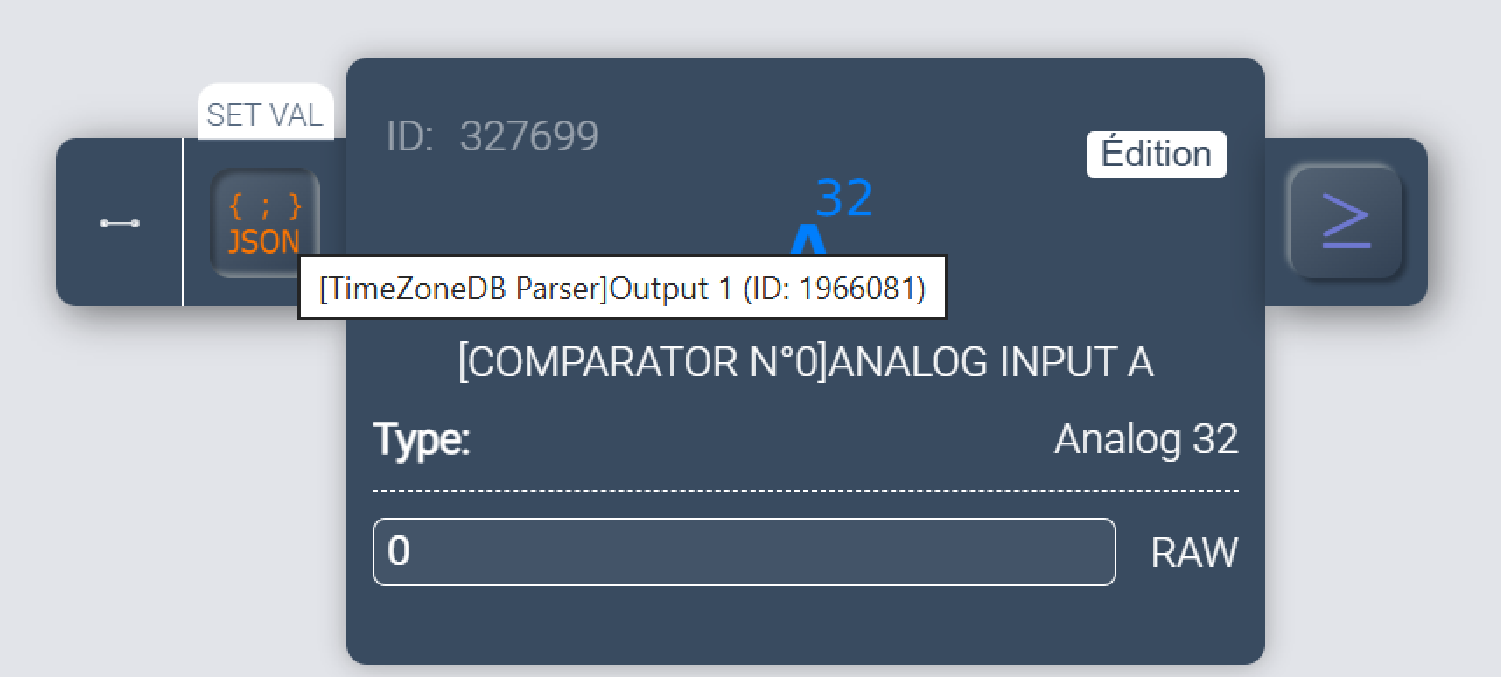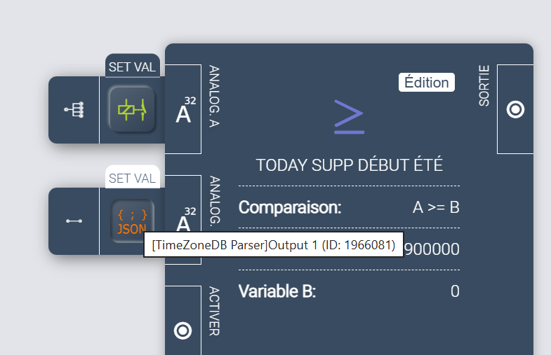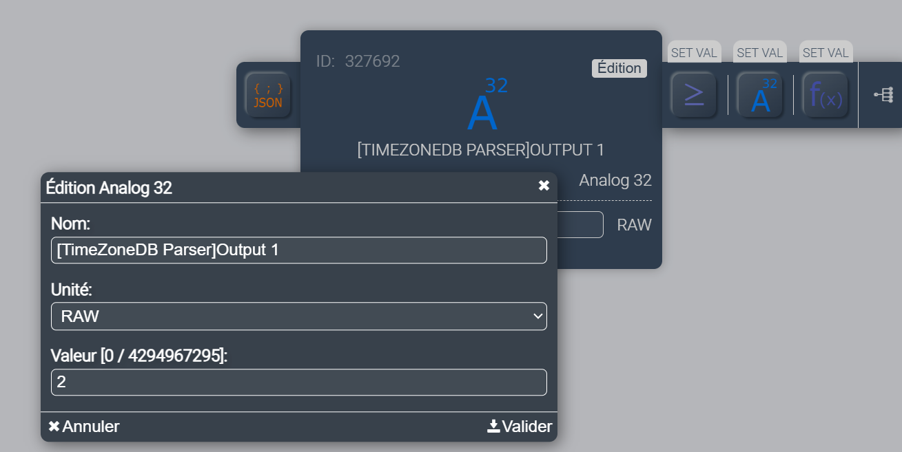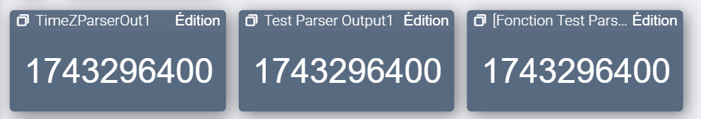 Je stocke les valeurs (en RAW) de zoneStart et zoneEnd dans les output respectifs 1 et 2 d’un parser dont j’affiche le contenu sur des tuiles pour contrôle :