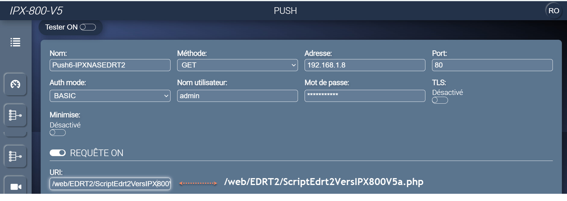 Côté EDRT2 je fais un push avec l’URI suivante en pointant sur l’IP de mon IPX800