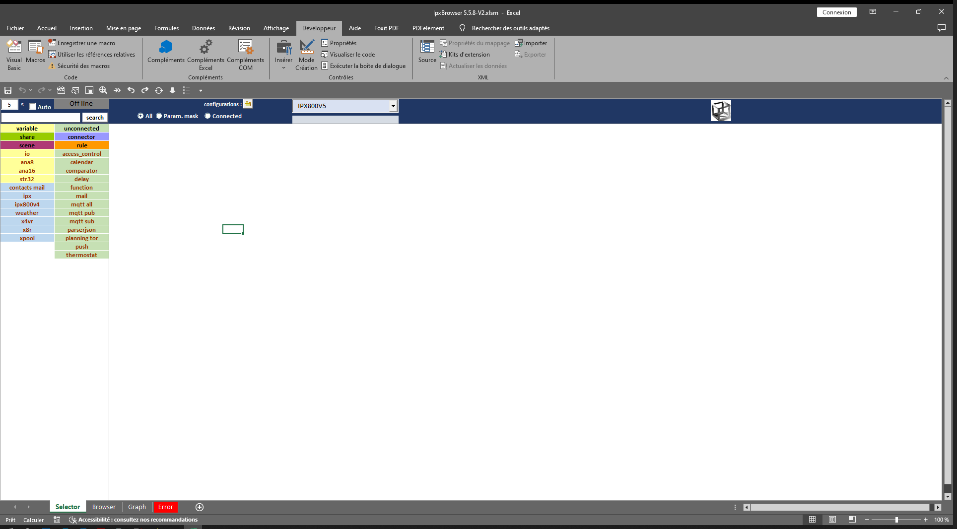 Le module de validation utilisé par Connection test est un module générique qui est utilisé lors de chaque connexion d’IpxBrowser à un IPX800V5 (connection test, request Api, rafraichissement des variables, set variable, capture pour le module Graph) et qui indique la nature du problème rencontré dans l’indicateur de connexion de façon, à mon avis, assez explicite (voir les deux exemples d’erreurs détectées dans le message précédent). C’est également ce module qui affiche « File config » dans l’indicateur de connexion lorsqu’un Ipx externe est sélectionné ou si la configuration affichée n’est pas celle présente dans IPX800V5 correspondant.