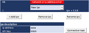 Les « Ipx locaux » auxquels il est possible de se connecter à l’aide des données de connexion. Ces données de connexion doivent être validées par Connection test pour être prises en compte. Connection test valide à la fois l’adresse Ip et l’API Key. Il ne semble donc pas nécessaire d’ajouter code verif ipv4. Voir plus bas les exemples de détection d’erreur par Connection test
