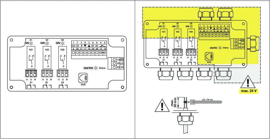 - vous avez utilisé des fils rigides 1,5 mm2 entre les relais d’isolement et les entrées des X-4VR V2 ce qui force sur les connecteurs des entrées (en particulier du X-4VR V2 de gauche). Vous pouvez tout à fait utiliser des fils provenant d’un câble ethernet à la place.