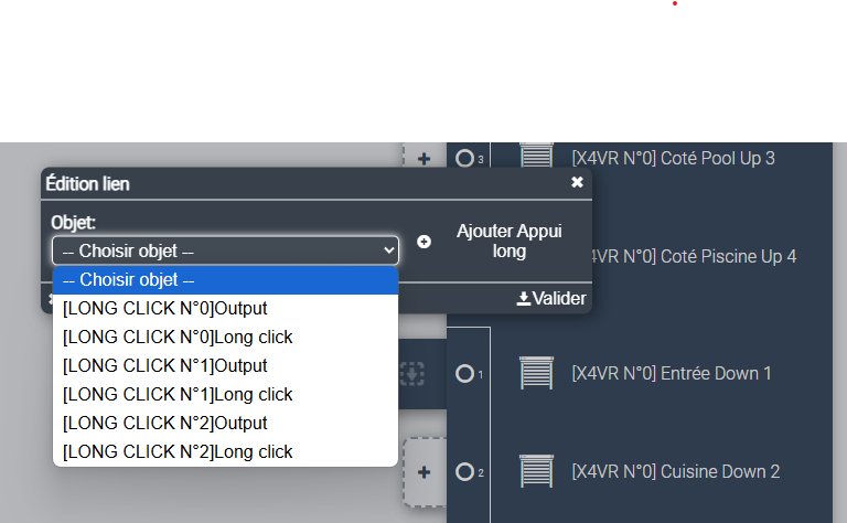 Bonsoir. les 8 volets fonctionnent correctement par de simples poussoirs individuellement. Je vois bien les commandes Up, Down et Stop pour chacun des volets…J’essaie, sans succès, d utiliser l’appui long sur le volet 1 en down pour commander la descente des 8 volets…..j’ai fait différents essais en vain…visiblement je n’ai pas encore intégré la logique de programmation avec le moteur de lien… j’ai créé un connecteur Appui Long sur le volet 1 et tenté de créer des sorties Down sur les 8…une aide serait la bienvenue…merci