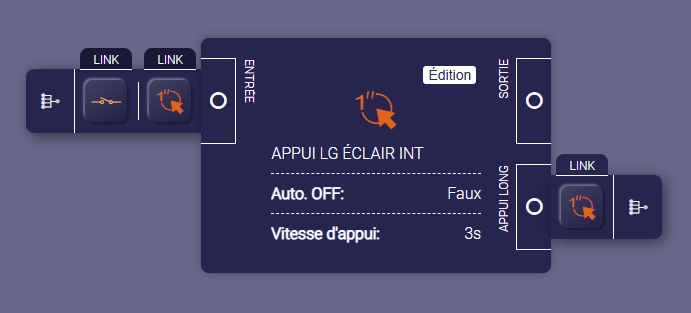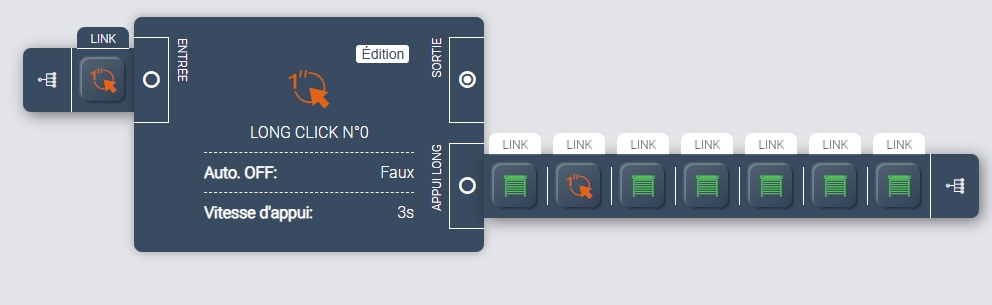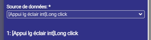en entrée j’ai créé le connecteur Long click n°3 puis Long click qui est venu se positionner lorsque j’ai mis en sortie appui long click input….qui est le point d’entrée de l’événement dans le scénario… Visiblement j’ai tout faux…le bouton physique ne donne rien…(sur la matrice de voyants l’appui long reste inactif…il n-y a aucun lien avec le scénario…j’ai bien vu la commande Utiliser dans scénario mais j’ignore comment s’en servir.. je n’ai rien vu dans le wiki à ce propos….sauf erreur de ma part…je souhaiterai votre aide…D’avance merci