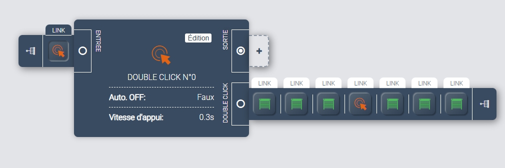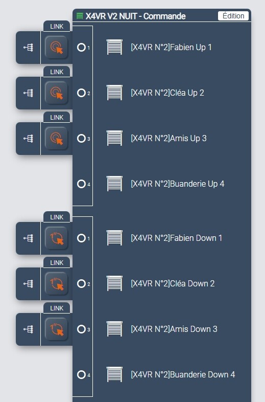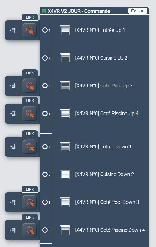 Bonsoir, OK pour la partie logicielle, la commande globale montée se fait par double clic et celle de descente par appui long…sur le dashboard les deux boutons fonctionnent parfaitement….par contre si l’action se fait manuellement sur n’importe quel d’entre eux en appui long comme en double clic, rien ne se passe si ce n’est le mouvement du seul volet concerné…..j’ai du zappé quelque chose….que manque-t-il pour que les boutons physiques se comportent comme les boutons logiciels ??? Merci….cela progresse mais ce n’est pas encore suffisant… dans le lien d’entrée faut-il mettre double click ou output ??