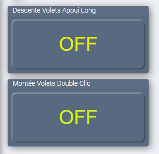 Bonsoir, la nuit portant conseil, j’ai finalement réussi à créer la montée de tous les volets par un appui long et à les faire descendre par un double clic. D’un point de vue Dashboard j’ai créé deux boutons ON/OFF. Il me reste à vérifier sur place l’action physique sur les poussoirs uniques….