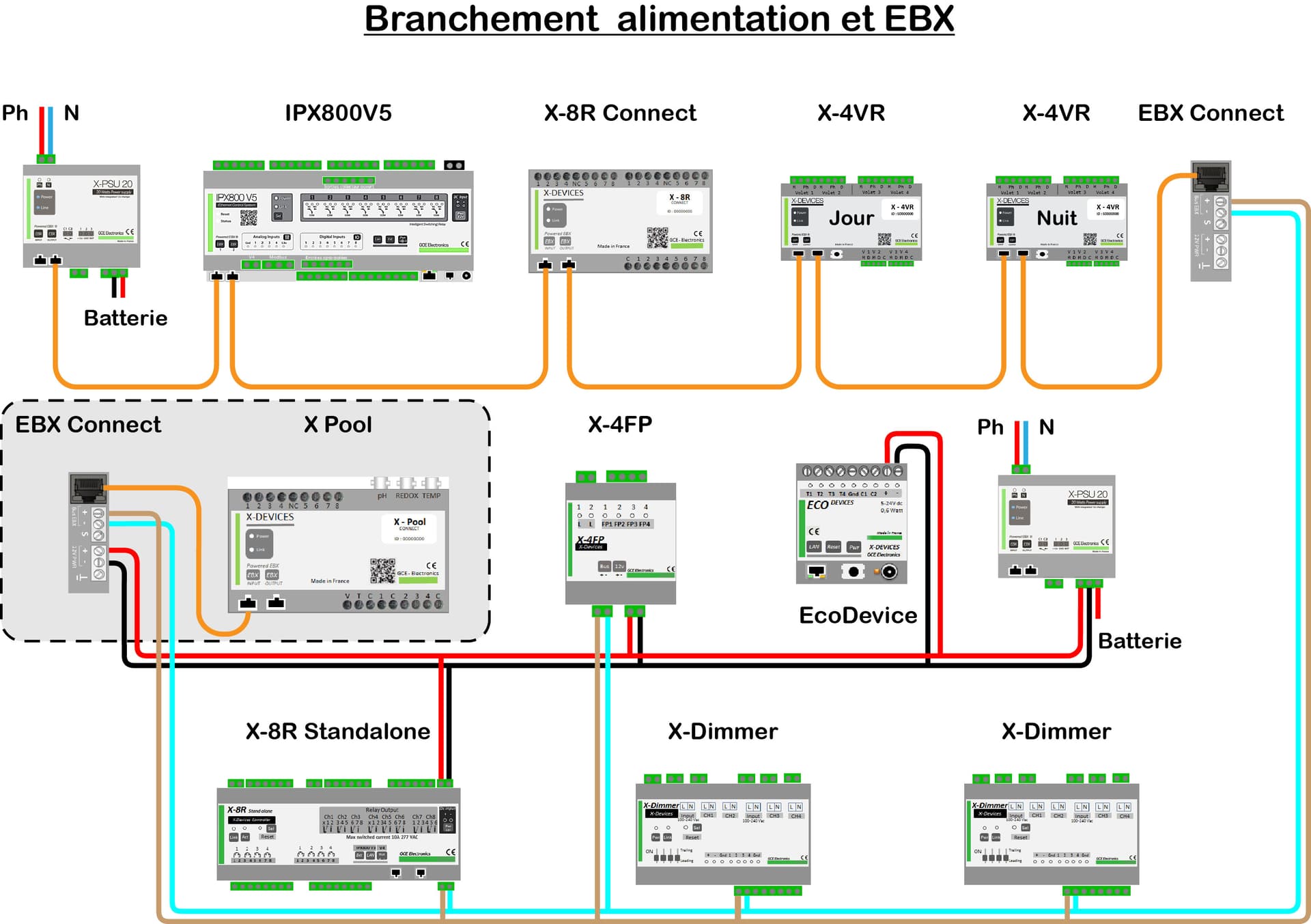 Si vous devez le faire (voir raisons ci-dessus) alors l’idéal serait une liaison RJ45 entre le X-4VR Nuit et la seconde X-PSU, une liaison RJ45 entre la 2nde X-PSU et le X-8R Standalone puis un EBX Connect et l’EcoDevice, X-4FP, etc…