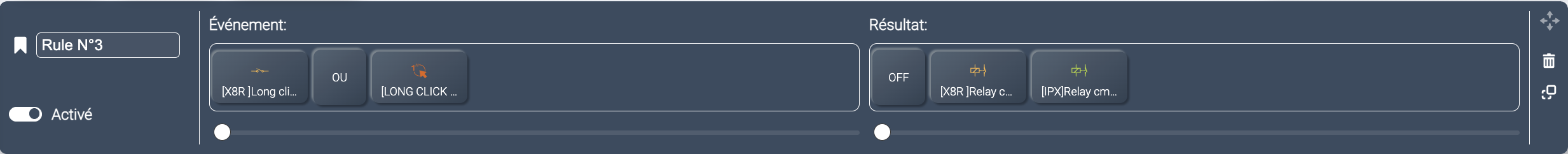 L’objet Appui long me sert de lien entre le BP du dashboard (source Long click) et l’événement du scénario ( long click Input) comme indiqué précédemment.. Après de multiples tentatives je n’arrive pas à créer un lien entre un appui long sur le X8RConnect (que j’ai préalablement activé comme décrit dans la doc) et une sortie vers l’événement du scénario ( long click input), je me retrouve en doublon de liens…..Dois-je concevoir mon scénario autrement en préservant le BP logiciel sur le dashboard ? Que dois-je mettre dans le connecteur entrant du cmd du X8RConnect et dans le connecteur de sortie du X8R Connect?? Merci de votre aide