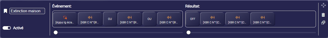 Bonsoir, pour gérer les éclairages intérieurs et extérieurs, je dispose d’un x-8R Connect et d’un X-8R Standalone. Les deux sont en mode télérupteur (bouton poussoir simple). Dans le dashboard j’ai créé un bouton ON/OFF par pièce et point d’éclairage extérieur (c’est plus pratique que la matrice de voyants pour identifier la pièce concernée). J’aimerai maintenant créer une commande dans le dashboard pour permettre l’extinction de toutes les pièces dont l’éclairage est ON (d’autres étant OFF) au moment de quitter la maison. Est-ce que l’usage d’un bouton poussoir en appui long peut me permettre également d’assurer l’extinction des éclairages qui sont ON sans passer ceux qui sont OFF sur ON ??. Concernant les éclairages extérieurs j’aimerai pouvoir également globaliser l’allumage….Merci de votre aide.