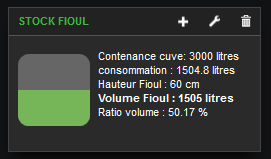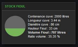 usage : comme précédemment, il suffit de renseigner le volume total de la cuve en litres, le diamètre de la cuve en cm, puis lier la variable hauteurFuel à la datasource, sur l’analogique de la sonde . la hauteur est attendue en cm.