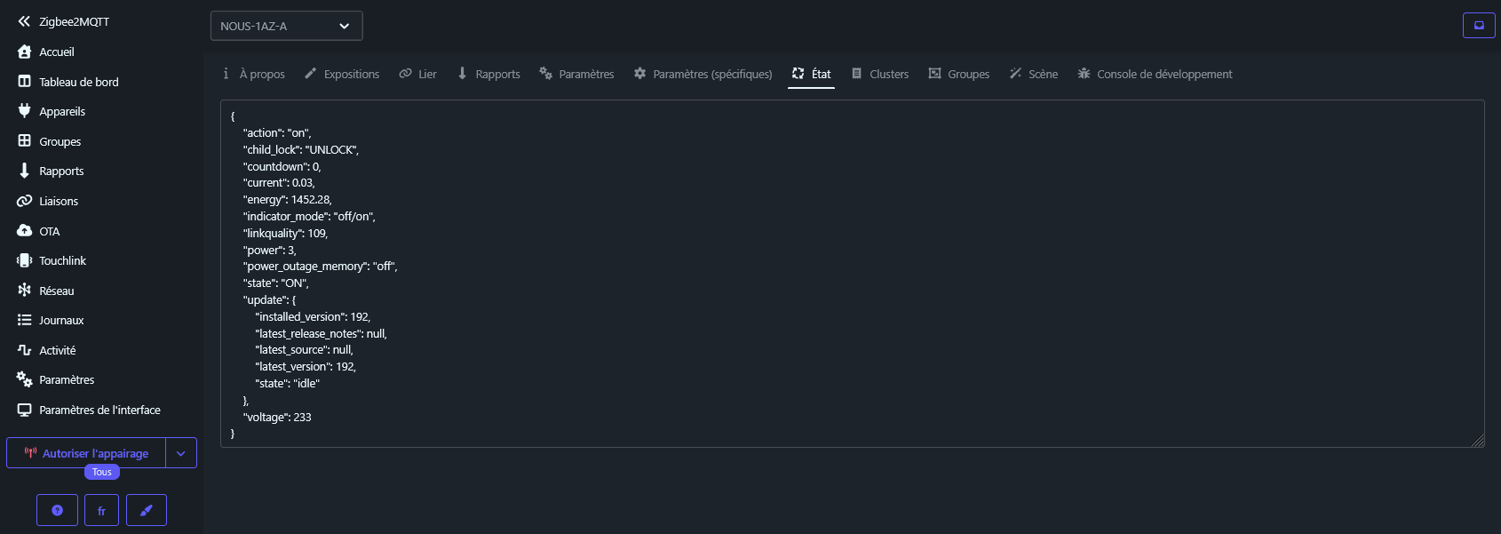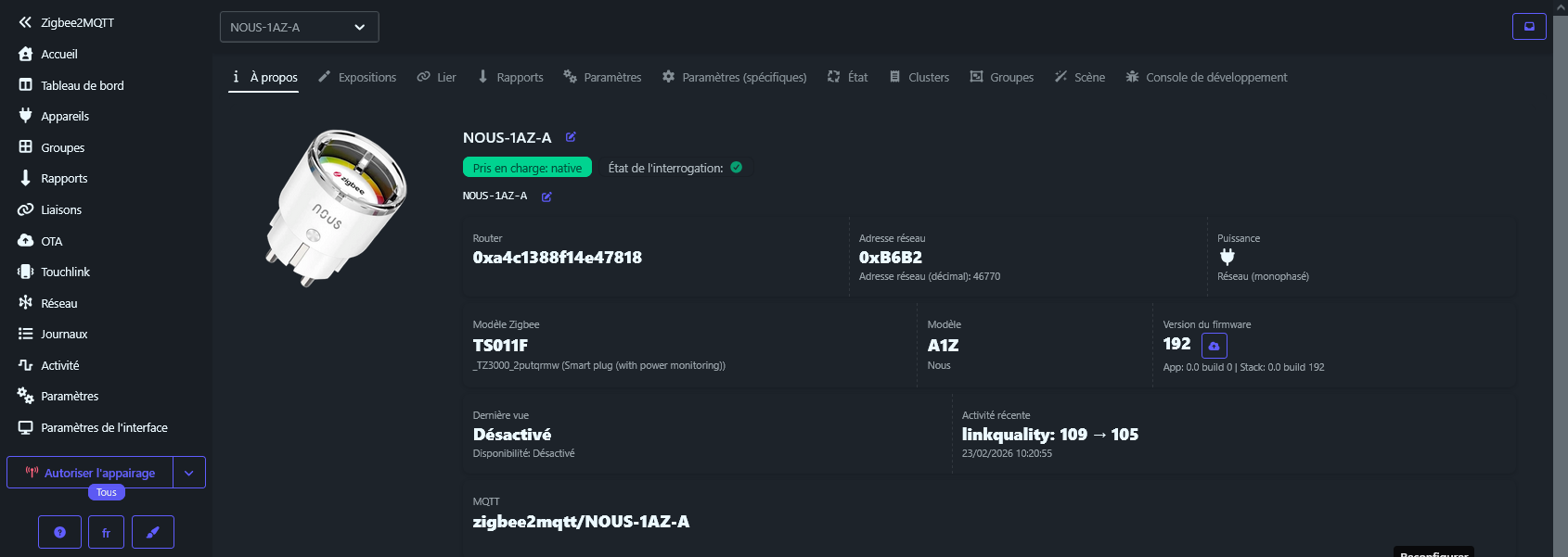 aller sur l’appareil et cliquer, on obtient (ici une prise NOUS A1Z)