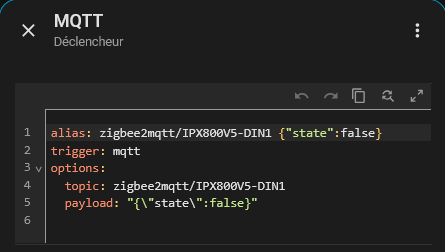 on sélectionne dans le cadre « MQTT Déclencheur » « modifier en yaml »