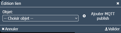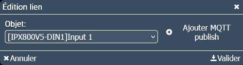 Donc dans l’édition de lien, on va relier la sortie digitale 1 à un « MQTT publish » en cliquant sur le « + » à droite