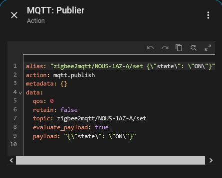 alias: « zigbee2mqtt/NOUS-1AZ-A/set {"state": "ON"} »