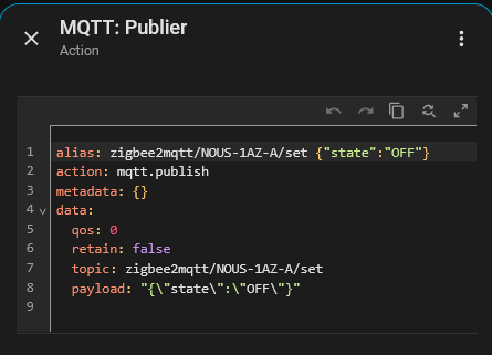 alias: « zigbee2mqtt/NOUS-1AZ-A/set {"state": "OFF"} »