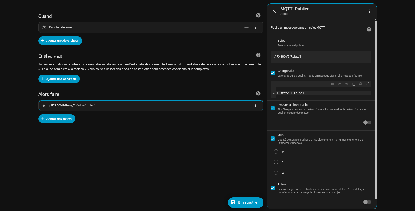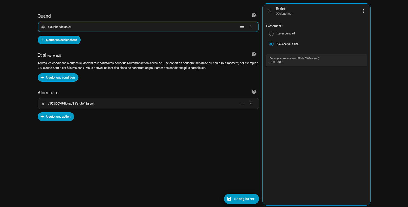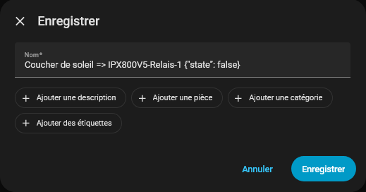 et on enregistre en nommant Coucher de soleil => IPX800V5-Relais-1 {"state": false}