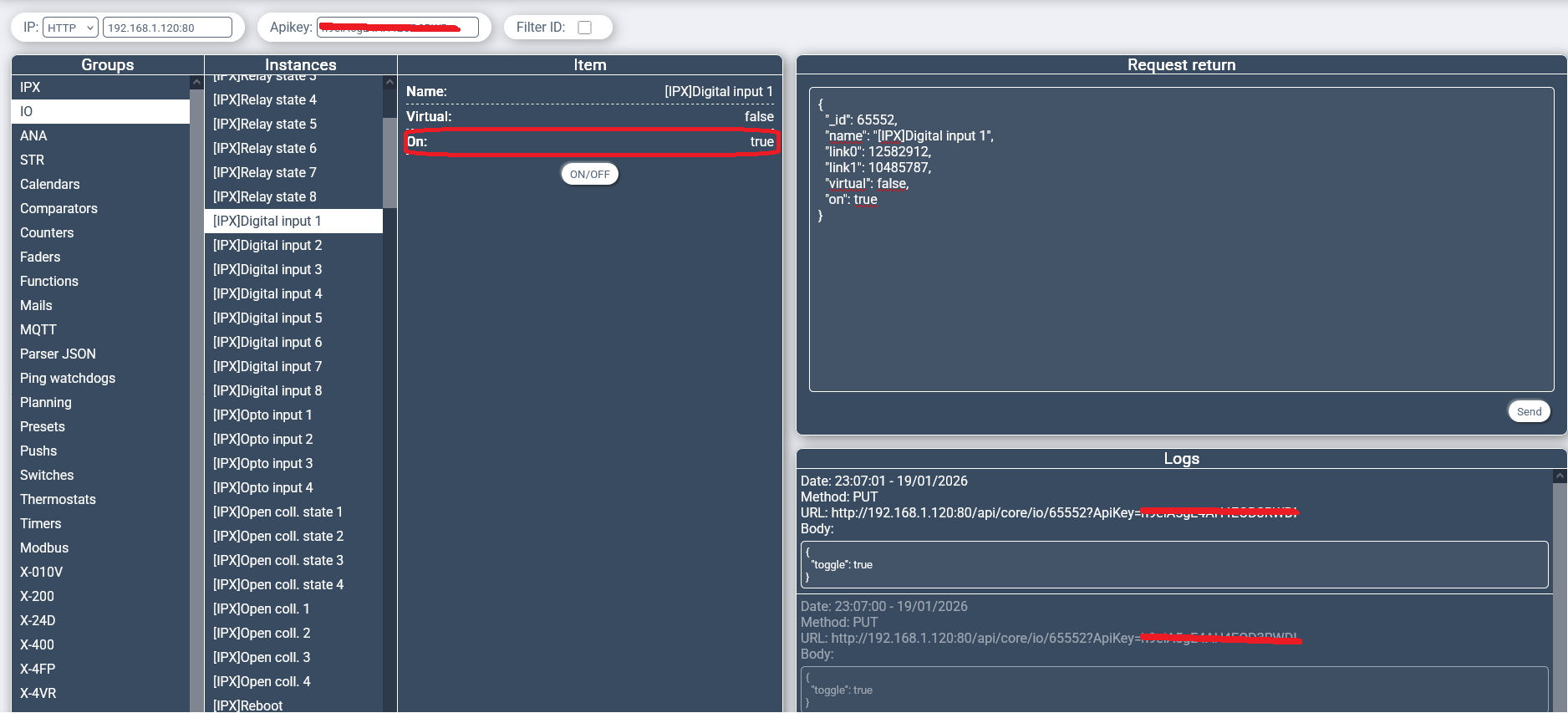 on peut aussi le voir par en mettant directement l’URL http://192.168.1.120/api/core/io/65552?ApiKey={mettre apikey de l’ipx}