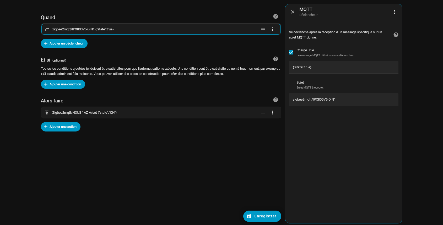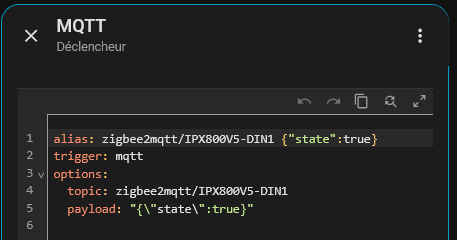 alias: zigbee2mqtt/IPX800V5-DIN1 {« state »:true}