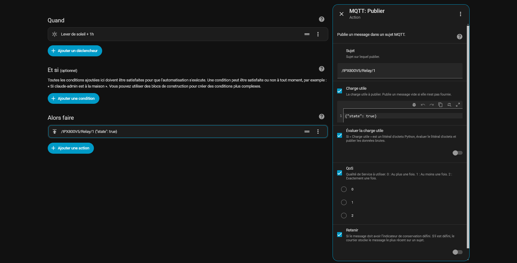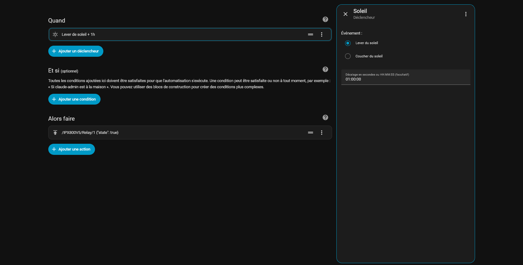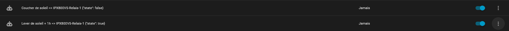 On a maintenant les deux automatisations qui active le relais 1 de l’IPX800V5 entre le lver du soleil plus une heure et le coucher du soleil (partique pour les volets roulants ! ![]()