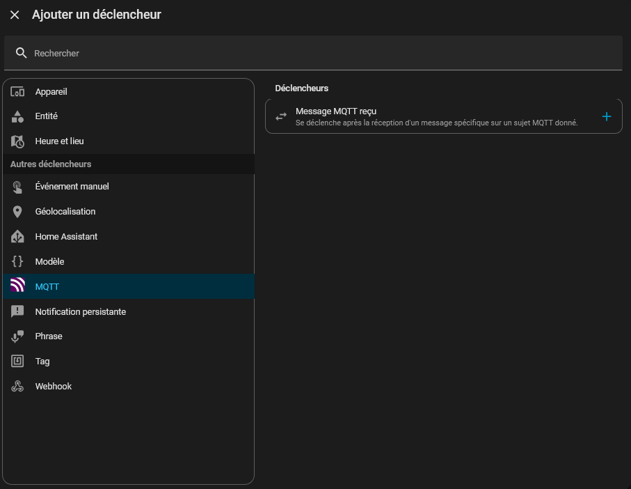 Dans Home Assistant / Paramètres / Automatisations et scènes / Créer une automatisation / Créer une nouvelle automatisation / Ajouter un déclencheur / MQTT / Message MQTT Recu
