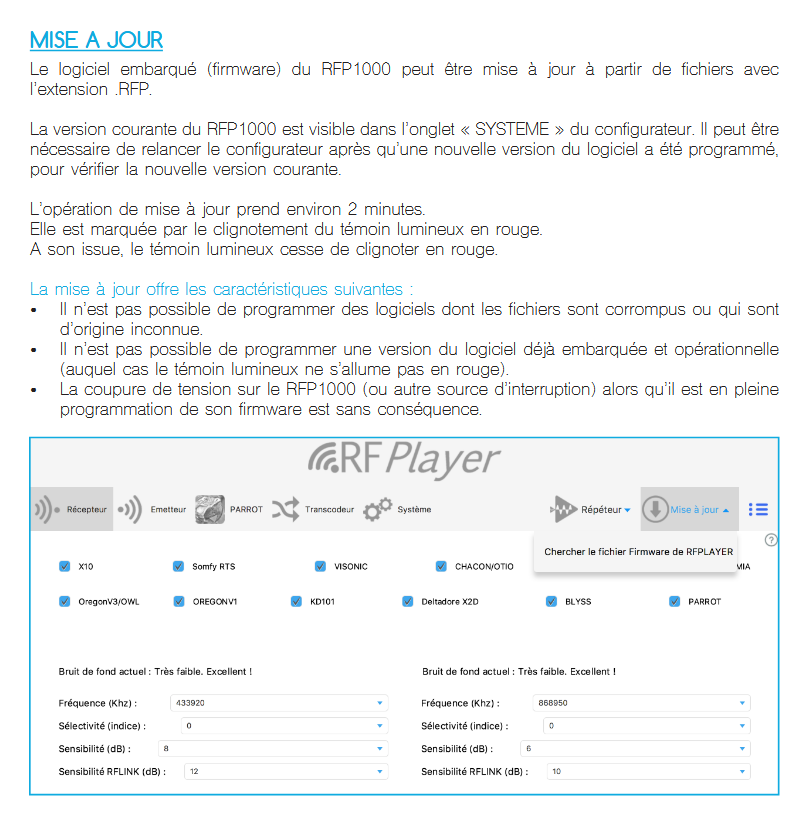 Je viens d’acheter un RFPLAYER 1000 pour le mettre sur une box eedomus. La box m’indique qu’il faut mettre à jour le RFPLAYER. Quand je branche la clé sur un PC WIN11, j’ai un son, une lumière bleue et rien dans l’explorateur. Je me dis que c’est normal. Ensuite je télécharge et installe JAVA, puis l’utilitaire de configuration, que je dézippe…mais je ne sais pas comment l’ouvrir ! Quel fichier faut-il ouvrir ? Bref, je suis complètement paumé !