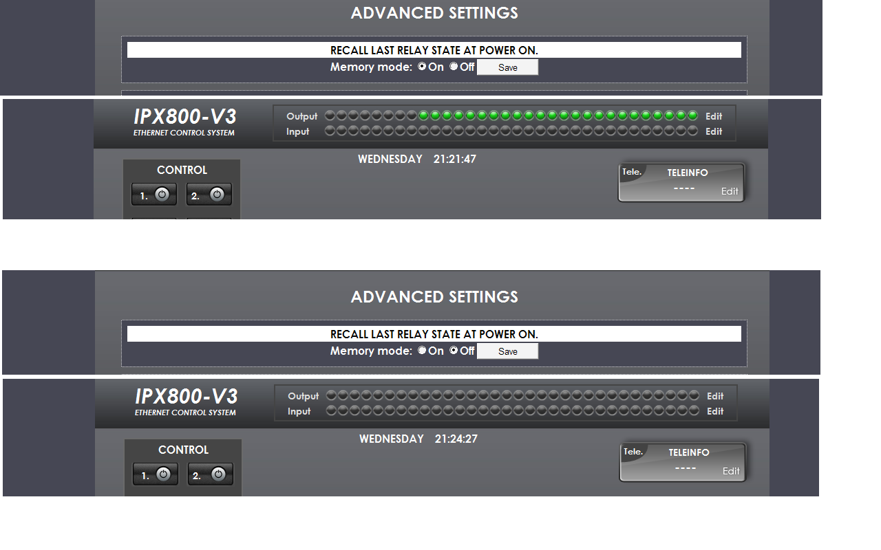 effectivement si tu coche la memorisation des etat en coupure tu as les sorties 9 à 32 en visu et si tu enleve la mémorisation les led 9 à 32 ne sont plus en visu
