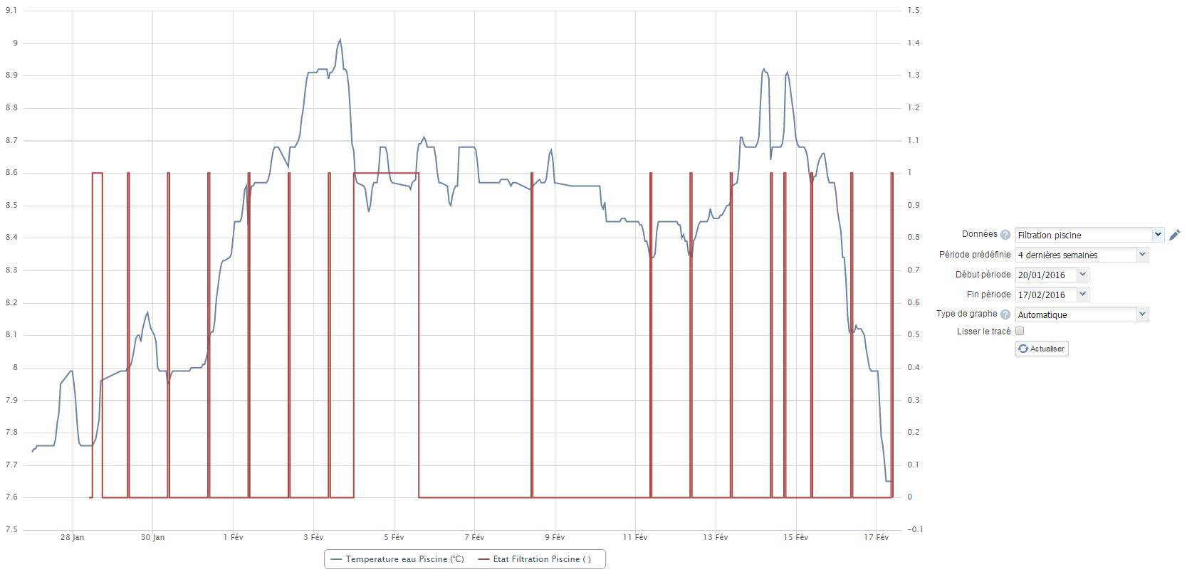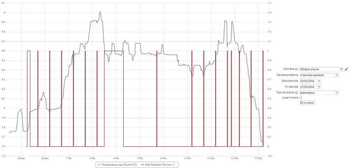 Ca me permet donc notamment de suivre avec un HISTORIQUE la temperature de l’eau de ma piscine (en bleu) et la durée de filtration ( les pics en rouge):