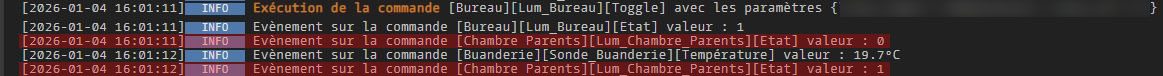 Voici le log en temps réel où l’on voit que l’état de la lumière de la chambre parents (branchée sur X-Dimmer) passe à 0 puis à 1 après avoir allumé la lumière du bureau (par contre la lumière réelle ne s’éteint pas et ne se rallume pas, c’est juste l’état dans Jeedom qui change) :