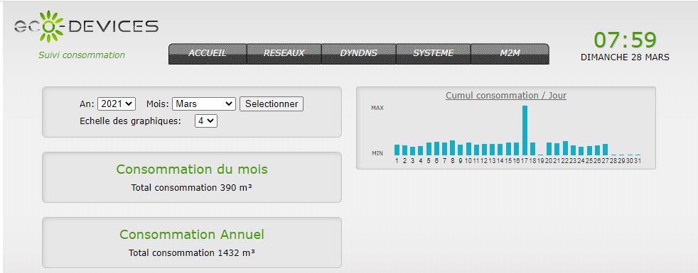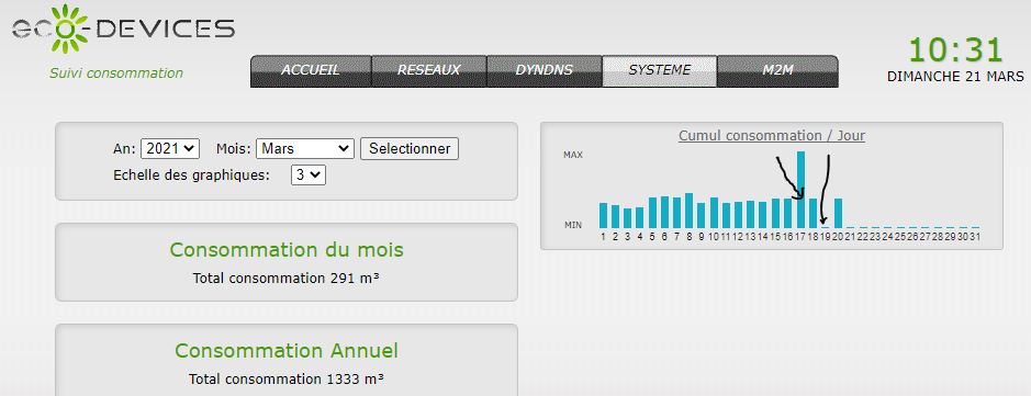 Depuis le bug arrivé une fois depuis 2013 , le comptage semble redevenir comme avant (2 valeurs bizarres). Quand je regarde le consommé , j’ai une valeur totale pour Mars qui semble logique (je n’ai plus les 67000m3 )…je continue à monitorer…