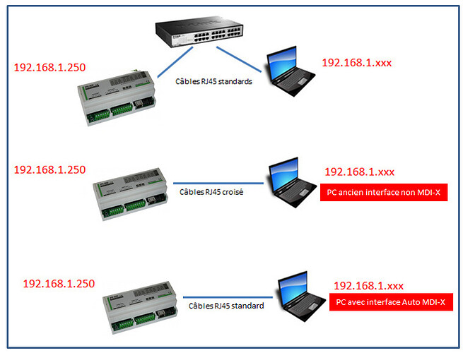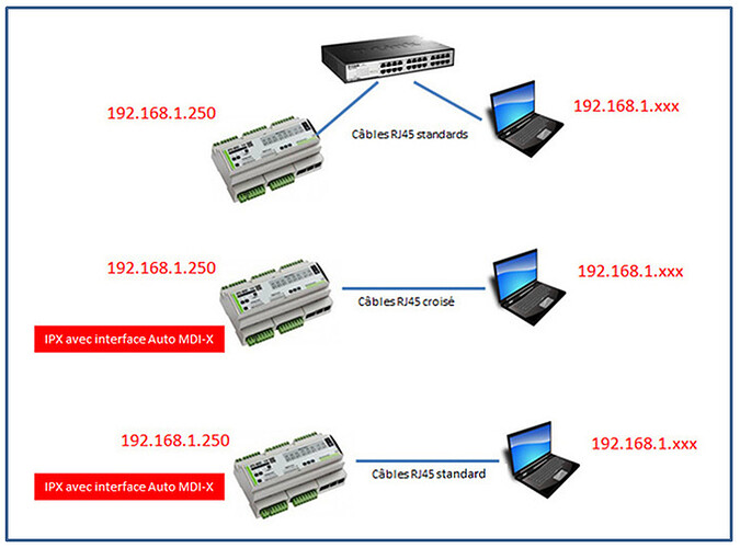 l’interface ethernet de l’IPX V4 est Auto MDI/MDI-X, ce qui veut dire qu’elle croise automatiquement les câbles si nécessaire. Donc il est possible d’utiliser un câble réseau standard pour connecter le PC directement à l’IPX v4 (pas besoin d’un câble croisé,)