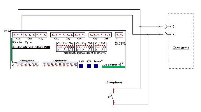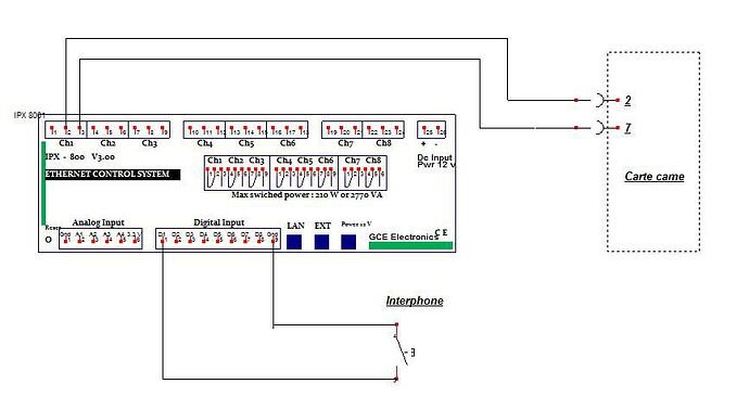 Je vais contacté mon représentant Came la semaine prochaine (je suis électricien mais je n’avais pas rencontré de problèmes avec les commandes d’ouverture même les sorties gâche électrique de portier remplacées par un relais). D’ailleurs, je vais essayer demain de mettre un relais commandé par la sortie d’IPX et le contact NO de ce relais sur 2 & 7 de la carte.