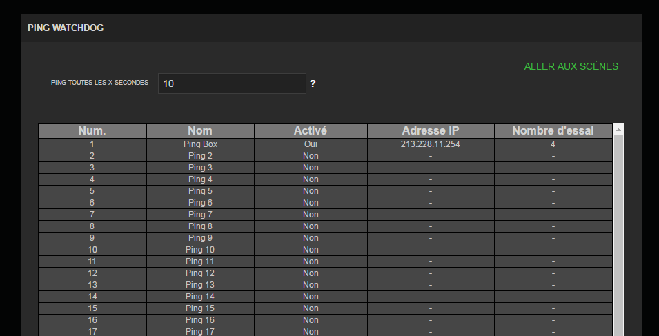 Je viens de mettre ça en test sur une sortie virtuelle avec un compteur afin de savoir s’il se déclenche et combien de fois. Je test en coupant le net le scénario se lance. Par contre l’appel du ping ne se fait qu’une fois? Il n’y a pas moyen de le lancer genre toute les X minutes quand il n’y a pas de connexion?