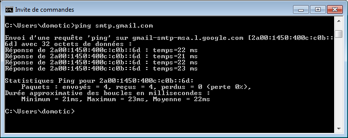 sinon, il suffit de pinguer le DNS de son FAI. smtp.gmail.com c’était pour l’exemple de l’usage du nom, plûtot que l’IP fixe qui n’est peut être plus utilisée. au même titre que le 2e DNS google : 8.8.4.4