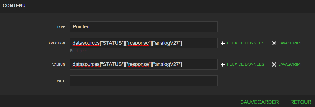 le widget pointer est natif à la v4, rien de compliqué, il suffit de créer une datasource vers status.xml, puis sélectionner la bonne analogique comme valeur