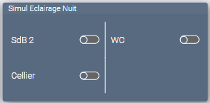Un widget pour chaque piĂšce permet de conditionner les actions sur VR ou Ă©clairage. Un toggle « VR 100% » permet dâautoriser ou interdire lâouverture complĂšte en journĂ©e ( par exemple, un VR au RDC ne sâouvrira jamais complĂštement mais suffisamment pour laisser passer la lumiĂšre intĂ©rieure Ă lâaube ou au crĂ©puscule de maniĂšre Ă ĂȘtre observable de lâextĂ©rieur). Cette valeur dâouverture partielle est fixĂ©e par une analogique liĂ©e au widget Dimmer.