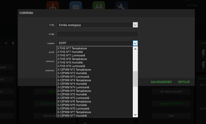 J ai un soucis avec mon chauffage depuis les versions 030, je gère mon chauffage au sol avec des sondes enocean dans les pièces,mais celles ci ne sont plus reconnu à partir de la version 030 depuis l ajout dans le menu déroulant de plus de capteur x-ths par ces mises à jour,ce qui fait que lorsque j enregistre le scénario avec une sonde enocean, l ipx enregistre une sonde xthl du coup je suis repasser en version 029 qui fonctionne bien en attendant